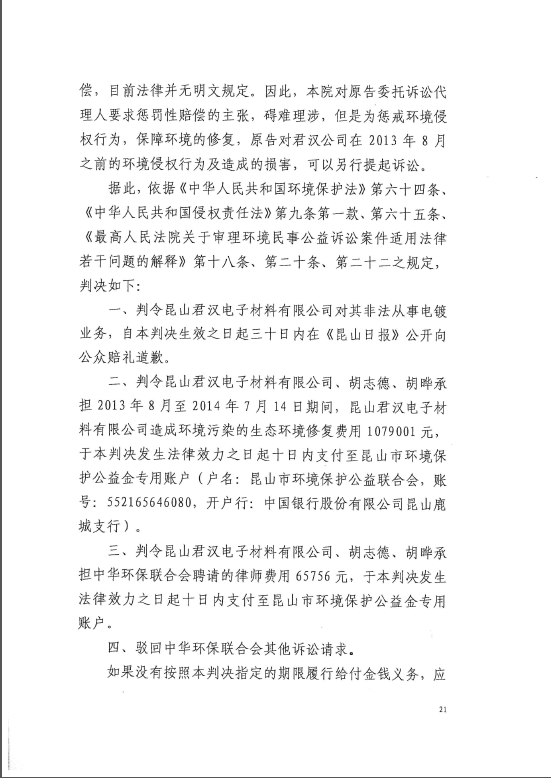 近日,中华环保联合会诉昆山君汉电子材料有限公司等三被告环境污染公益诉讼案在江苏省苏州市中级人民法院正式宣判。被告承担造成环境污染的生态环境修复费用107.9万元,并于判决生效之日起三十日内在《昆山日报》公开向社会公众致歉。