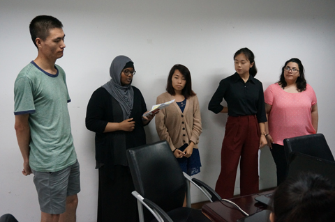 本次主题活动由Leslie女士主持,共分四个环节:联合会工作介绍、联合会在推动SDGs方面主要工作成果分享、SDGs简介、小组讨论与成果展示。第一环节,我会国际部姚玲玲从联合会的使命、目标群体、合作的组织和政府部门等方面,向大家介绍了联合会的发展历程及其在国际交流与合作方面所取得的进展。第二环节,我会国际部师未未以旨在“减少食物浪费”的中国青少年环保创意赛暨挑战赛为例,向大家介绍联合会在推动SDGs方面所做的努力和取得的成果。第三环节,我会国际部刘畅首先为大家介绍了联合国于2015年9月在联合国峰会上正式宣布的联合国可持续发展目标(SDGs),深入浅出地为大家剖析17项可持续发展目标的内涵意义。随后,Leslie女士结合当前中国环境教育面临的大背景与挑战,号召在座的美国大学生选择具体某项SDG ,进行青少年环境教育产品的设计与推广,旨在进一步提升中国中学生的环保意识水平和实践能力。值得一提的是,考虑到本次设计的环境教育产品将面向中国中学生群体,第四环节,我会国际部特邀两名中国学生代表和美国大学生们共同讨论策划,他们分别是来自中国科学院大学(UCAS)语言学专业的何淑菁同学和来自材料物理与化学专业的武慧斌同学。讨论策划采取“4+1”模式(4名美国学生+1名中国学生),共分成两组,限时1小时。在设计过程中,每个小组需确保设计的成果能提升中学生的环境保护知识储备,并能鼓励他们切实开展相关行动,进而提升其英语水平。
