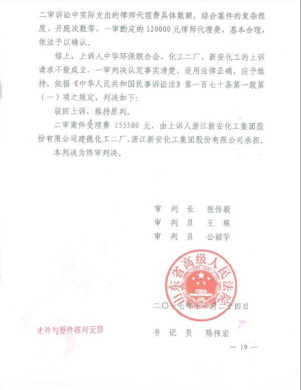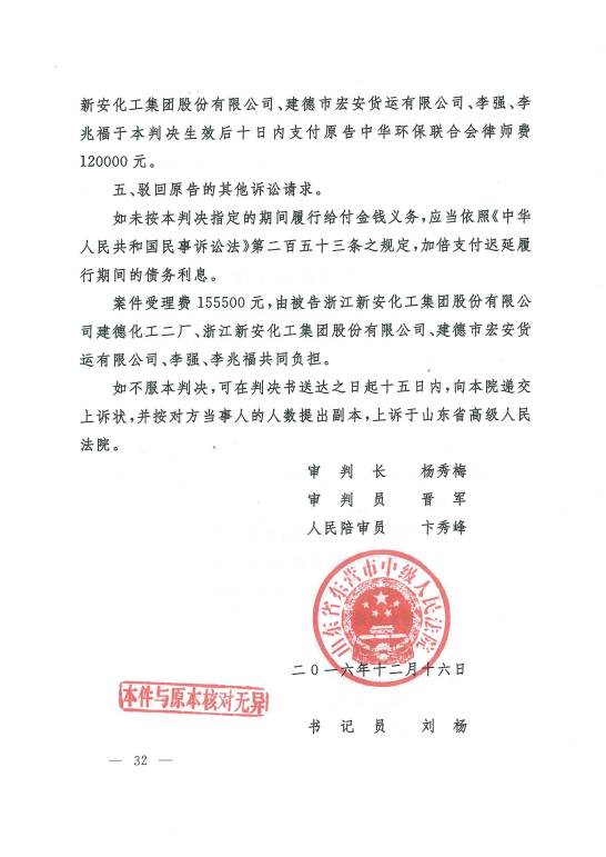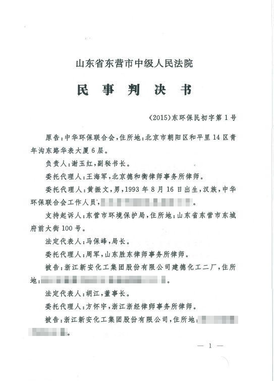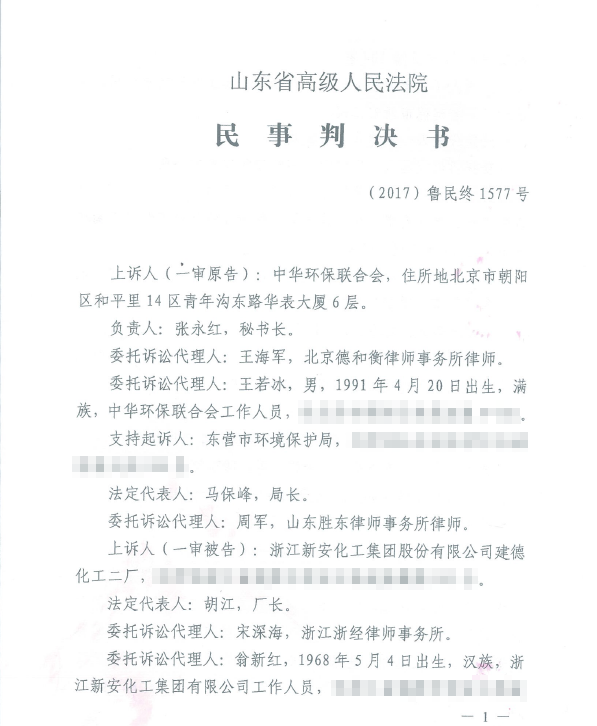 近日,中华环保联合会诉浙江新安化工集团股份有限公司等六被告环境污染公益诉讼案在山东省高级人民法院二审宣判,维持一审判决。