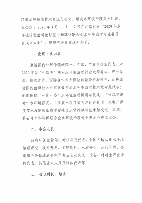 关于召开“2020水环境治理前瞻论坛暨中华环保联合会水环境治理专业委员会成立大会”的通知(第一轮)