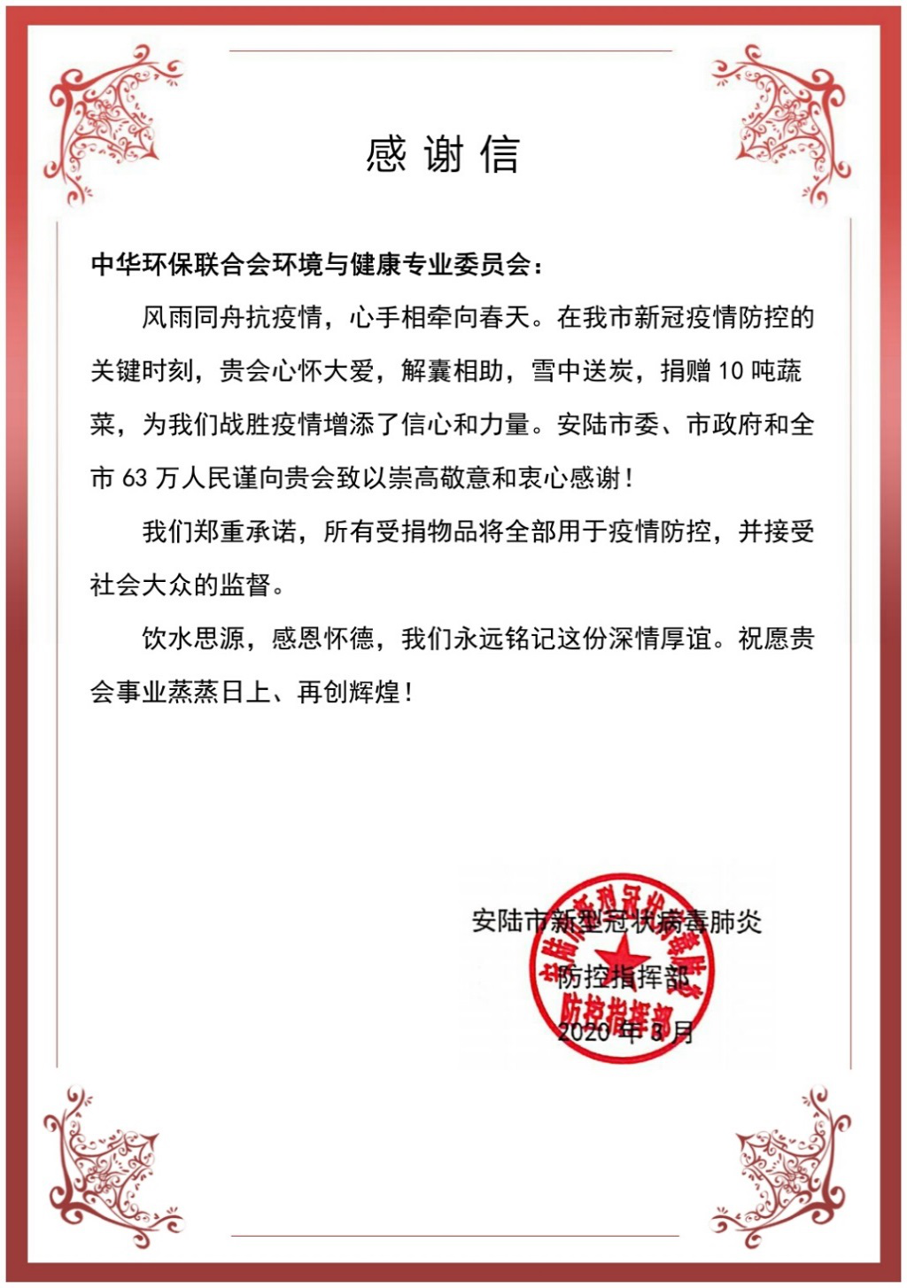 3月9日,安陆市新型冠状病毒肺炎防控指挥部给中华环保联合会环境与健康专业委员会发来感谢信。对环境与健康专业委员会能在疫情防控关键时期,心怀大爱、解囊相助、雪中送炭表达了深切的谢意。同时也表示,这一爱心行动,将极大地激励一线工作人员始终保持强大的战斗力、昂扬的斗志和旺盛的精力,坚决打赢疫情防控的人民战争、总体战、阻击战!