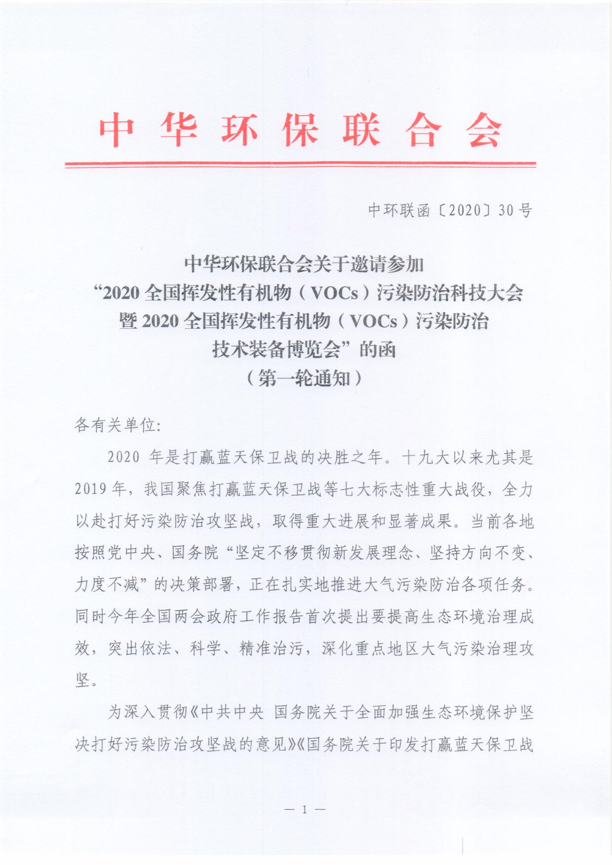关于邀请参加“2020全国挥发性有机物(VOCs)污染防治科技大会暨2020全国挥发性有机物(VOCs)污染防治技术装备博览会”的函(第一轮通知)
