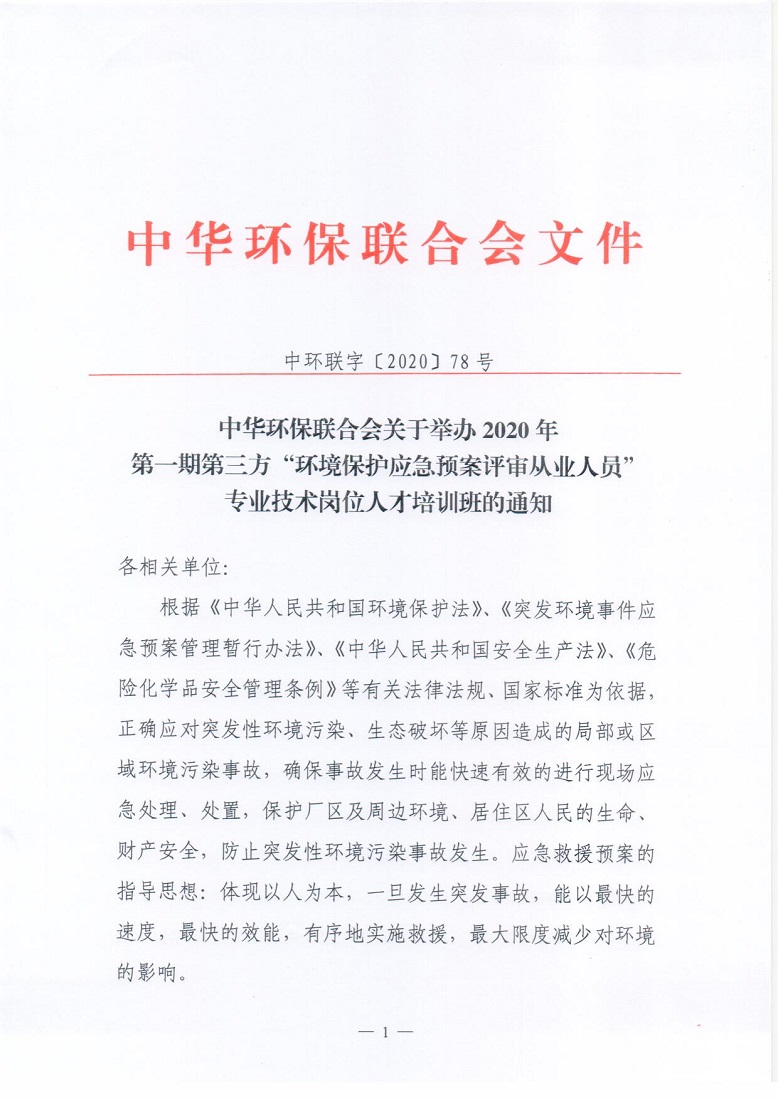 关于举办2020年第一期第三方“环境保护应急预案评审从业人员”专业技术岗位人才培训班的通知