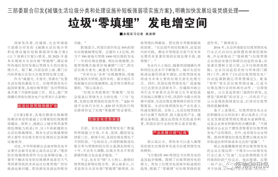 国家发改委、住建部、生态环境部日前联合印发的《城镇生活垃圾分类和处理设施补短板强弱项实施方案》(以下简称《方案》)要求,到2023年基本实现原生生活垃圾“零填埋”,满足条件的地区加快发展以焚烧为主的垃圾处理方式。据了解,目前包括上海、厦门在内的多地正在加大垃圾焚烧处理力度。