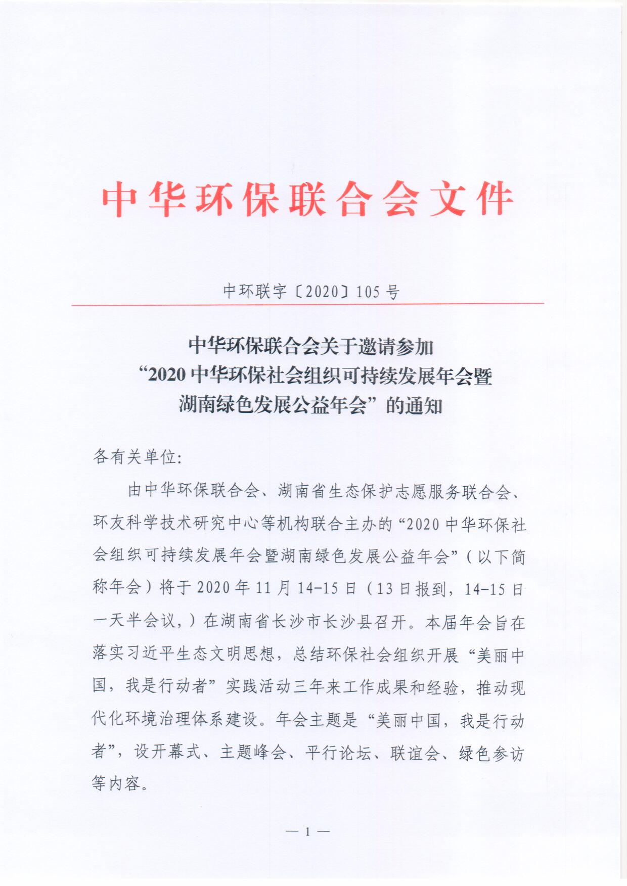 关于邀请参加“2020中华环保社会组织可持续发展年会暨湖南绿色发展公益年会”的通知