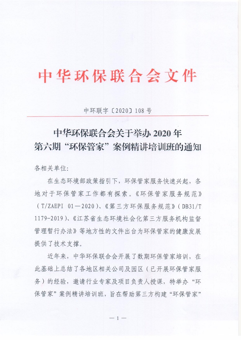 中华环保联合会关于举办2020年第六期 “ 环保管家 ” 案例精讲培训班的通知