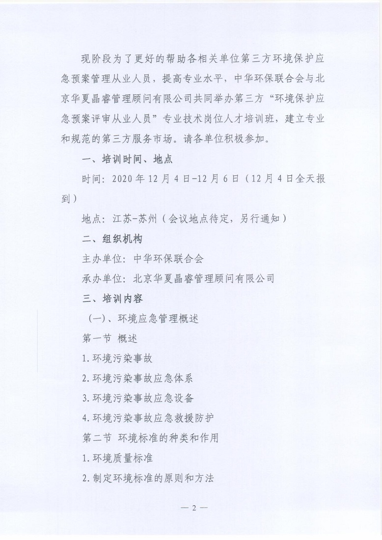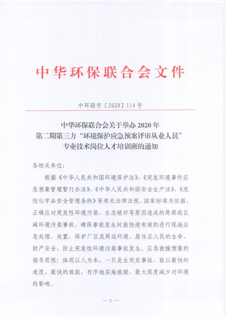 中华环保联合会关于举办2020年第二期第三方“环境保护应急预案评审从业人员”专业技术岗位人才培训班的通知