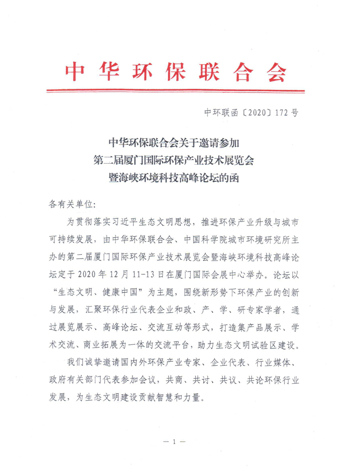关于邀请参加第二届厦门国际环保产业技术展览会暨海峡环境科技高峰论坛的函