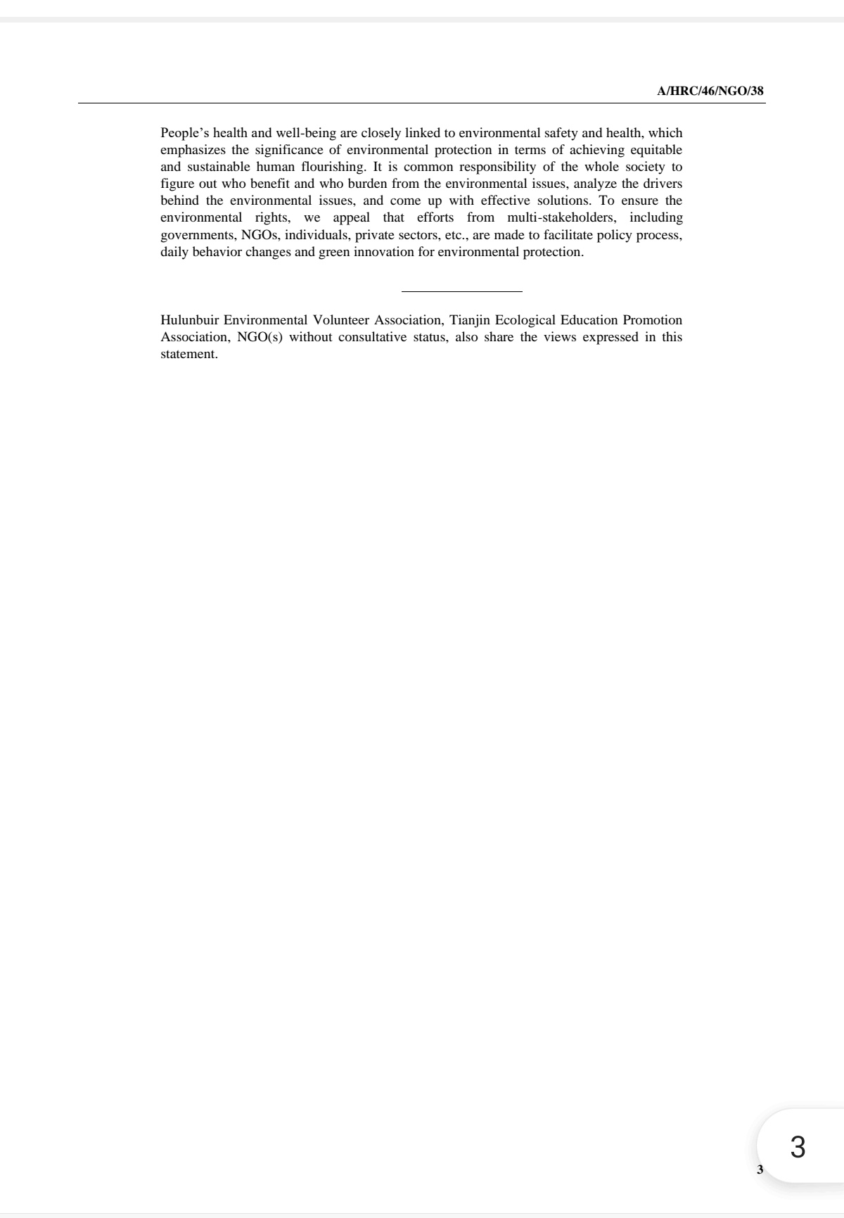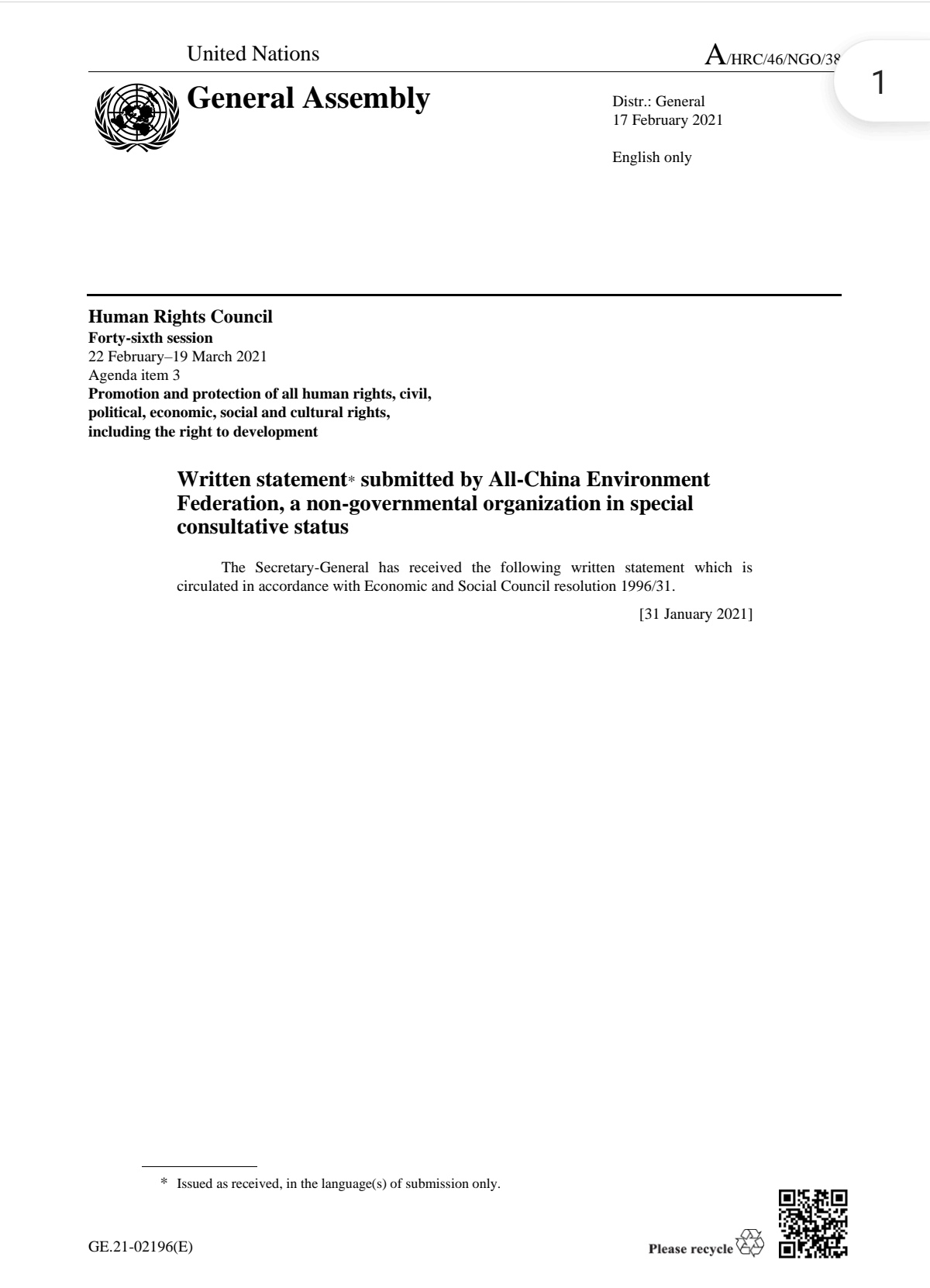 联合国人权理事会第46次会议于2月22日正式召开,会期为2月22日至3月19日。中华环保联合会(All-China Environment Federation),作为拥有联合国经社理事会特别咨商地位的一家全国性环保NGO,注册参加本次大会并于会议前夕向联合国正式提交书面发言。