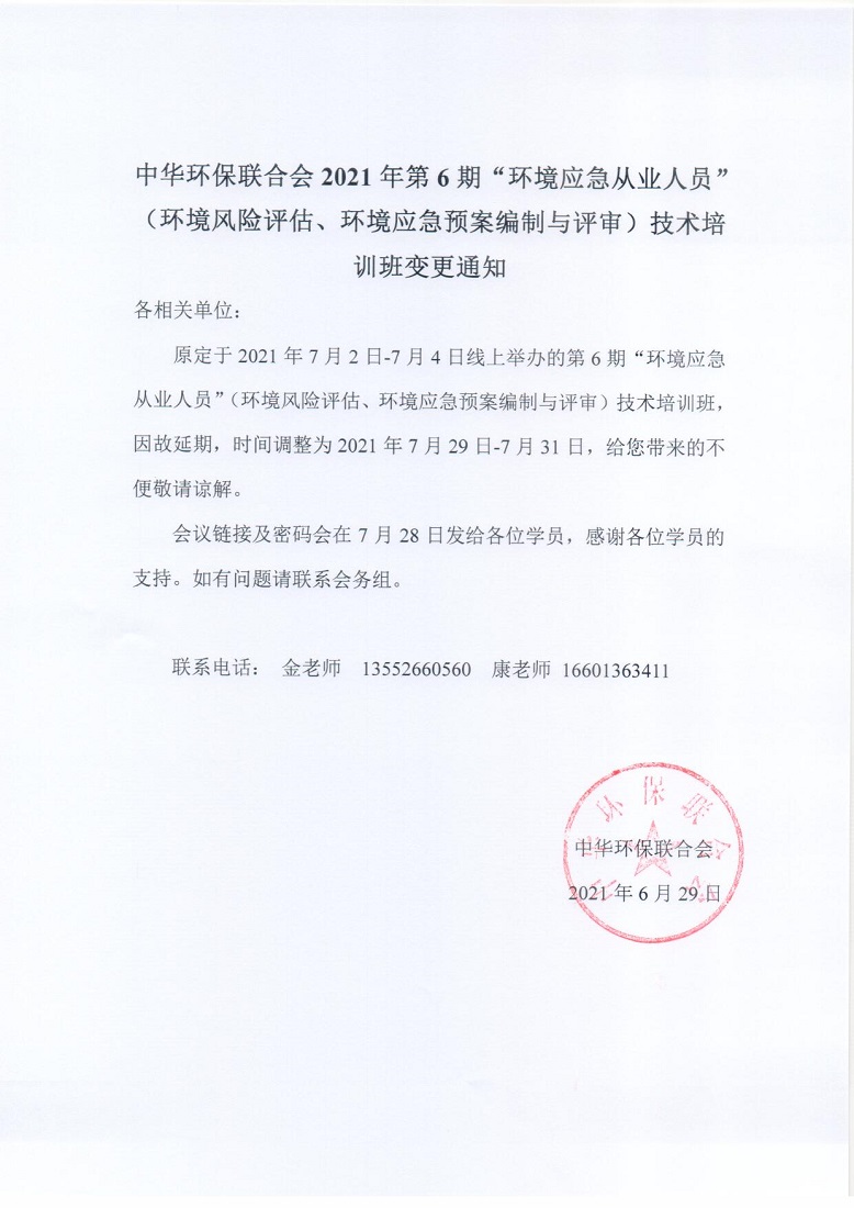 2021年第6期“环境应急从业人员”(环境风险评估、环境应急预案编制与评审)技术培训班变更通知