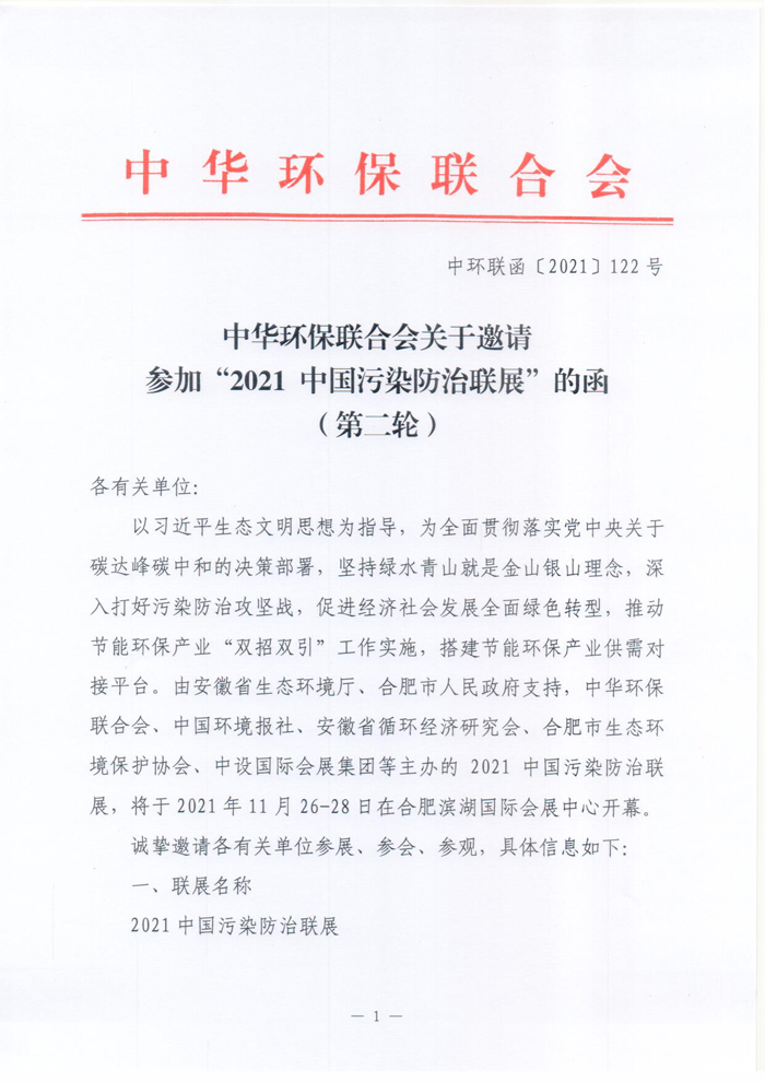 由中华环保联合会、中国环境报社、安徽省循环经济研究会、合肥市生态环境保护协会、中设国际会展集团等单位共同主办的2021中国污染防治联展将于2021年11月26-28日在合肥举办。