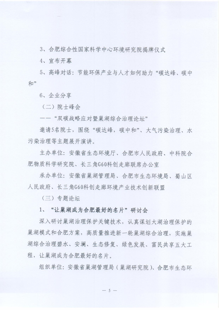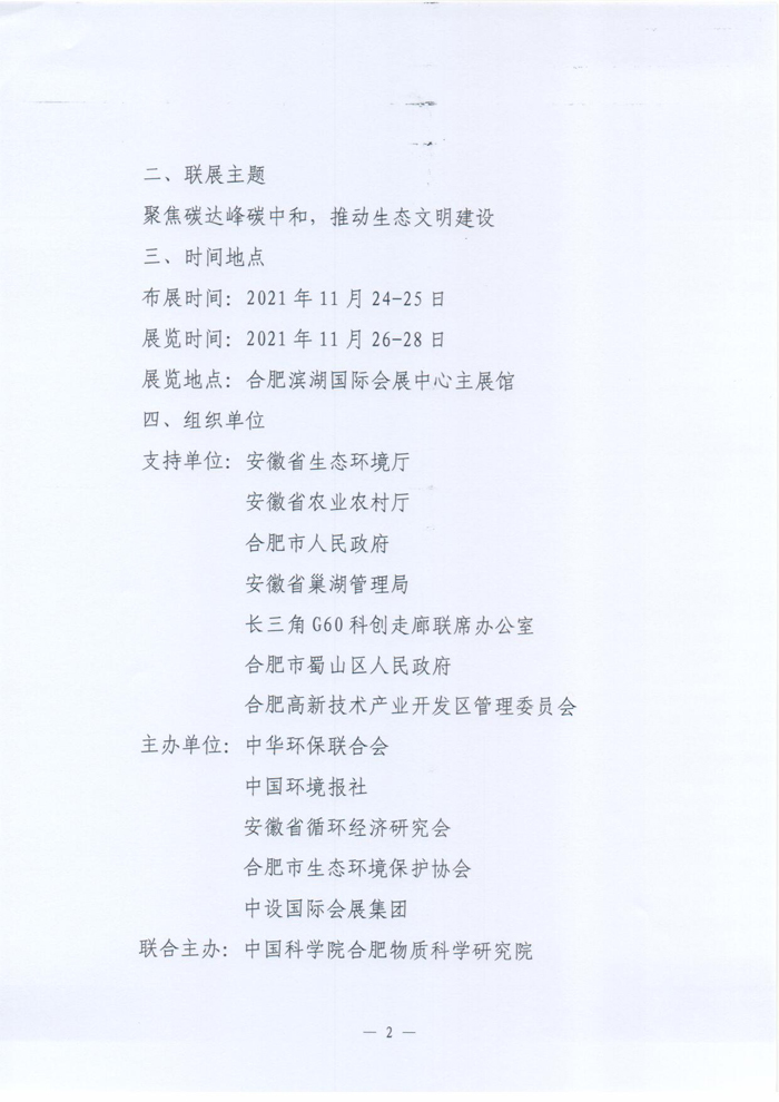 本届展会得到了安徽省生态环境厅、合肥市人民政府、安徽省巢湖管理局、长三角G60科创走廊联席办公室等多家单位支持,展会主题为“聚焦碳达峰碳中和,推动生态文明建设”。