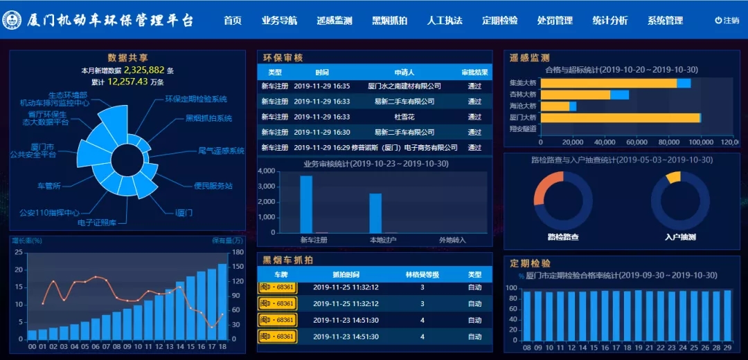 为强化尾气治理,从2015年开始,厦门生态环境局率先在全省开始建设机动车环保管理平台。按照边用边建、以用促建、以建促用的理念,先后建成一、二期系统。现在看到的二期系统就是日常办理机动车环保业务的工作系统,平台实现了与十多个部门在线业务协同,主要包括生态部机动车排污监控中心、省生态云平台、市公共安全平台、交警车管所和公安110指挥中心等。
