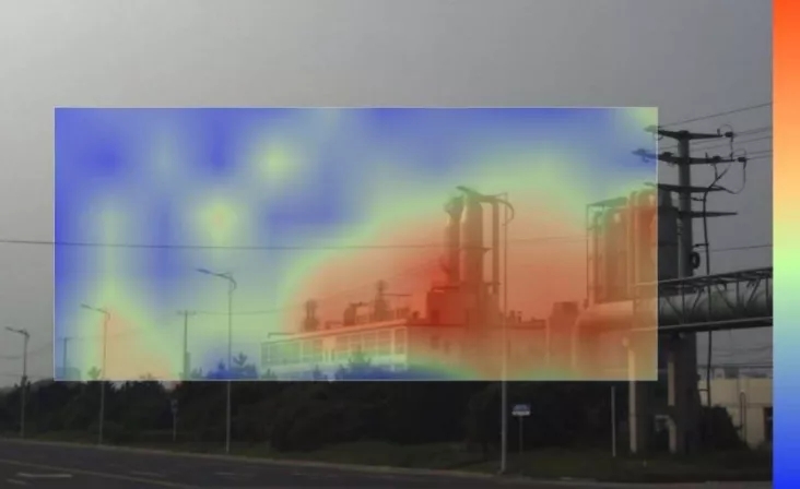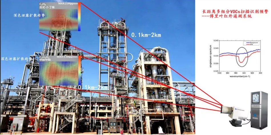 依据反演的污染气体种类和浓度信息,分别以不同颜色与扫描区域的视频图像进行伪彩叠加,实时呈现有毒有害污染气体在扫描区域的动态分布及扩散趋势,并对超标气体进行光声预警,利用两套遥测扫描成像系统可以快速确定泄漏点位置。