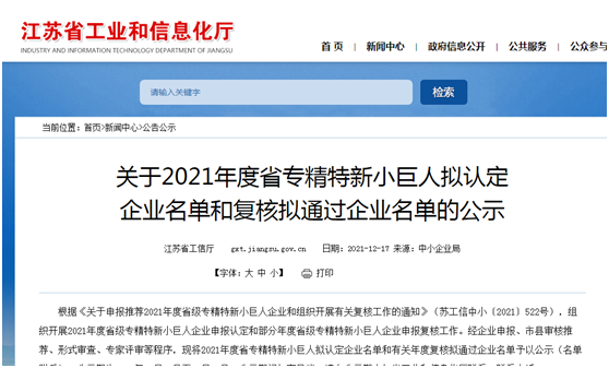 本次评选根据江苏省工业和信息化厅《关于申报推荐2021年度省级专精特新小巨人企业和组织开展有关复核工作的通知》(苏工信中小〔2021〕522号),组织开展2021年度省级专精特新小巨人企业申报认定和部分年度省级专精特新小巨人企业申报复核工作。经企业申报、市县审核推荐、形式审查、专家评审等程序,最终确定入围企业名单。