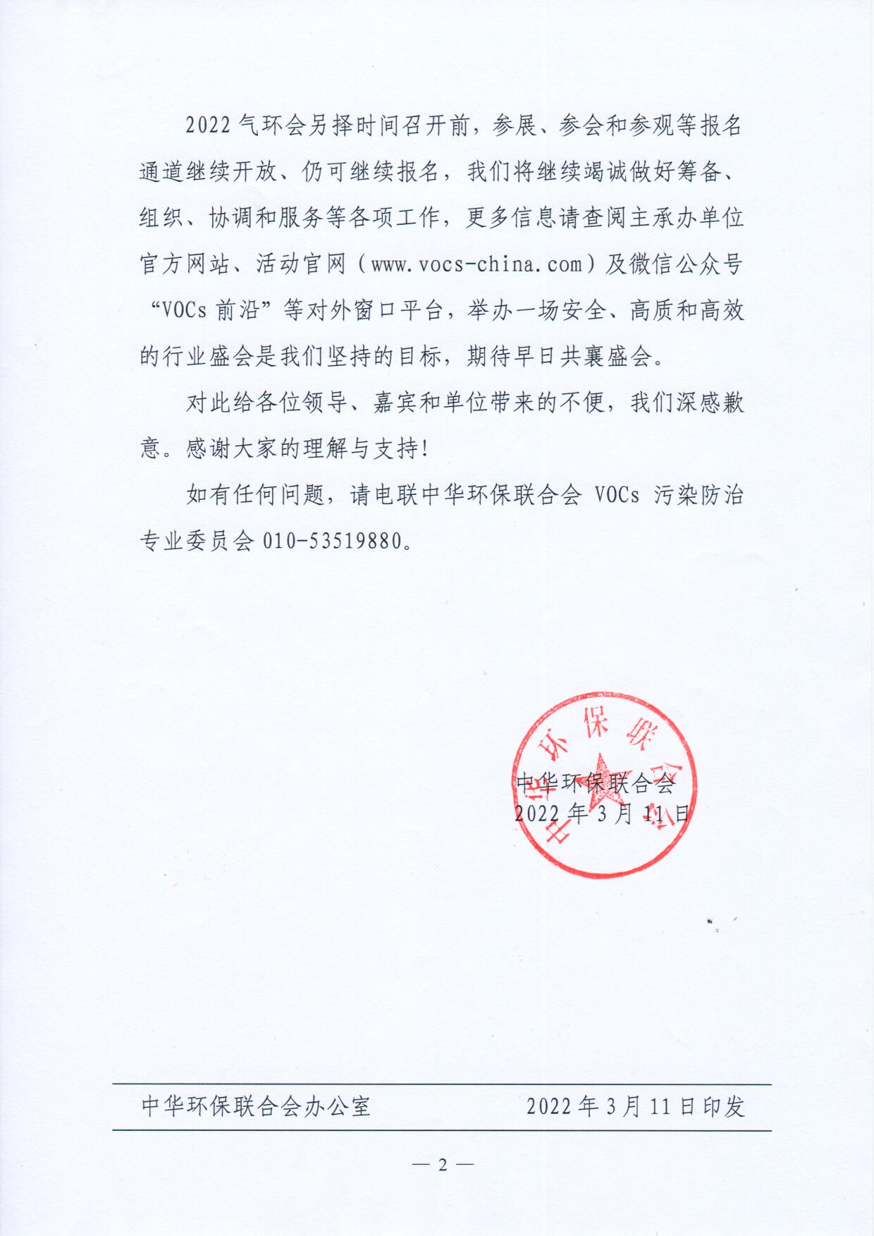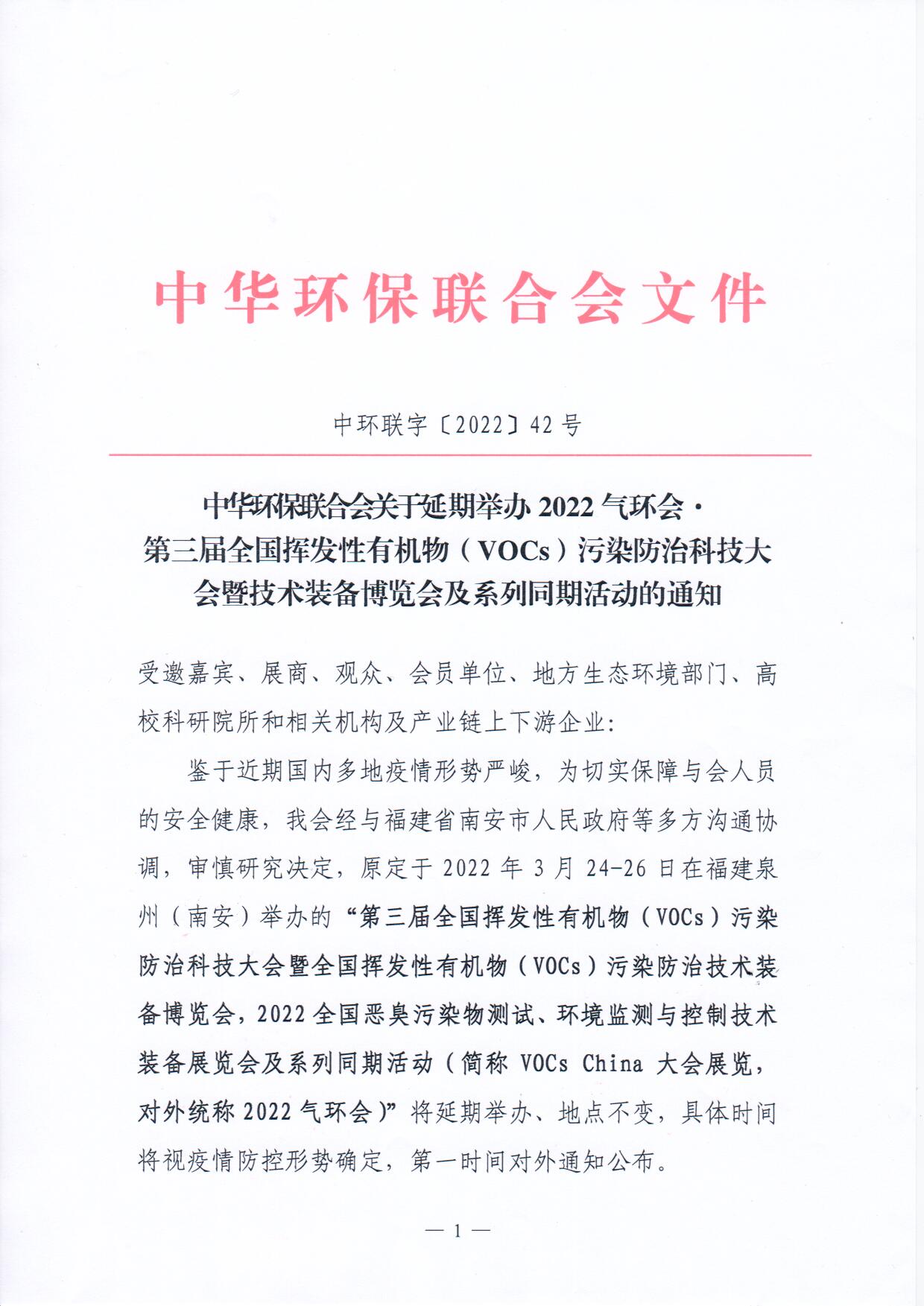 关于延期举办2022气环会第三届全国挥发性有机物(VOCs)污染防治科技大会暨技术装备博览会及系列同期活动的通知