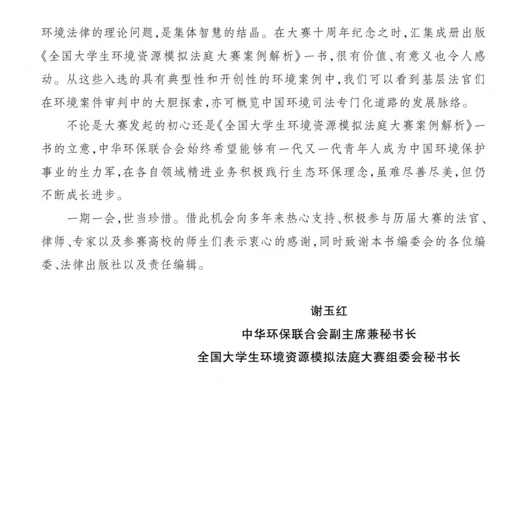 近日,《全国大学生环境资源模拟法庭大赛案例解析》一书已由法律出版社出版,在全国公开发行。本书既是一部可称之为精品的环境法案例教程,同时也是一部不可多得的由环境法官撰稿的环境法学术著作。