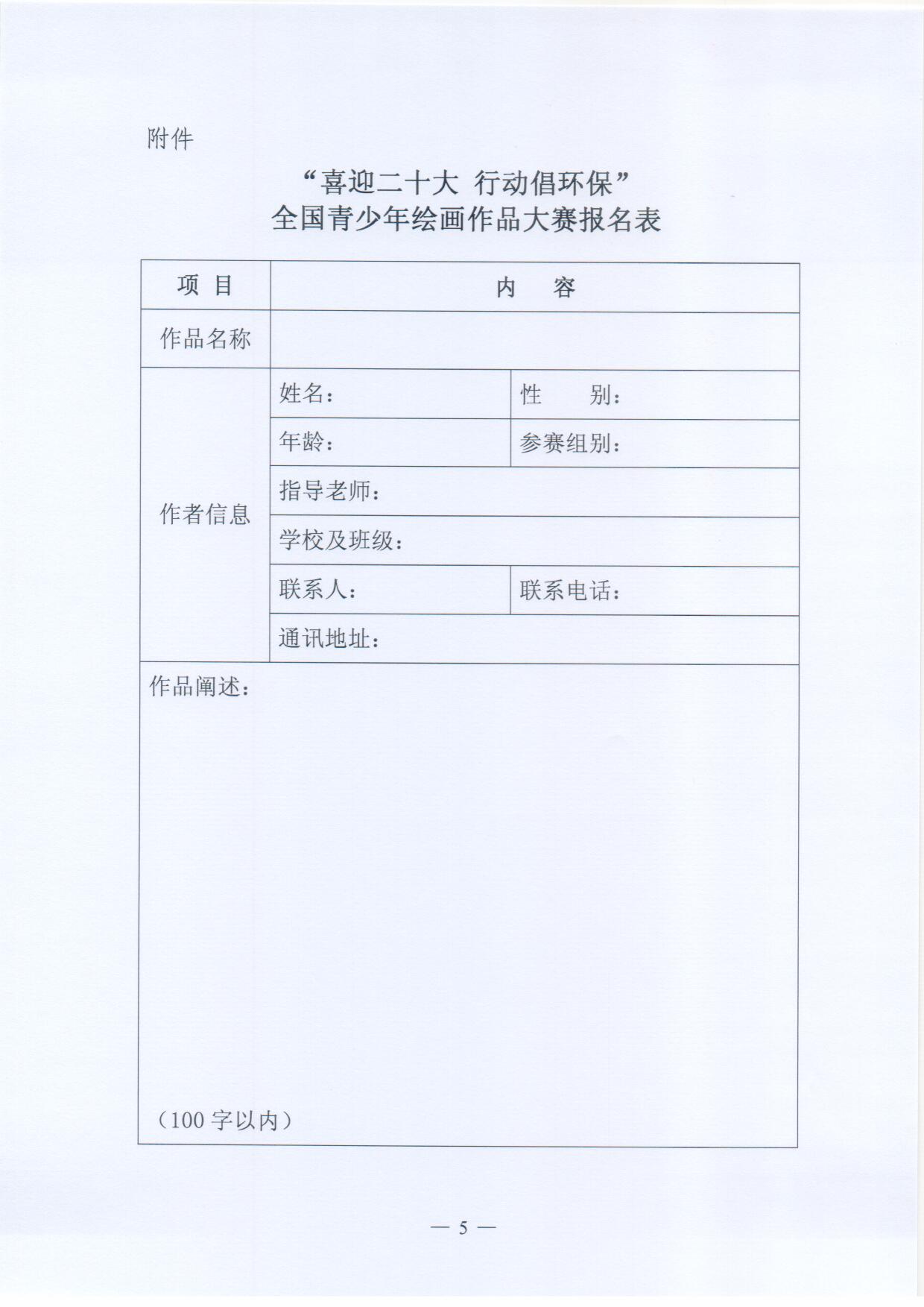 “喜迎二十大 行动倡环保”全国青少年绘画作品大赛报名表