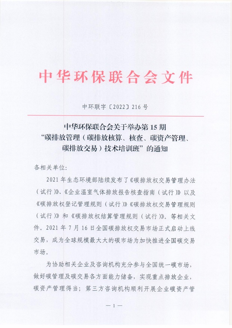 关于举办第15期“碳排放管理(碳排放核算、核查、碳资产管理、碳排放交易)技术培训班”的通知
