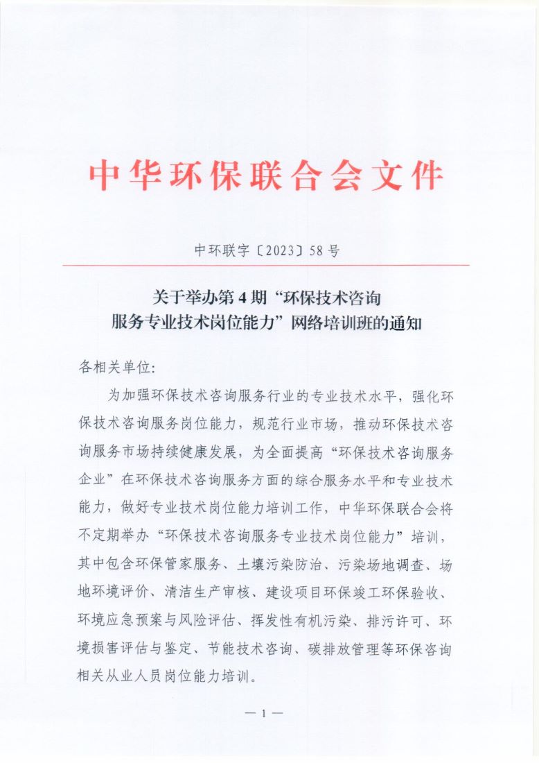 关于举办第4期“环保技术咨询服务专业技术岗位能力”网络培训班的通知