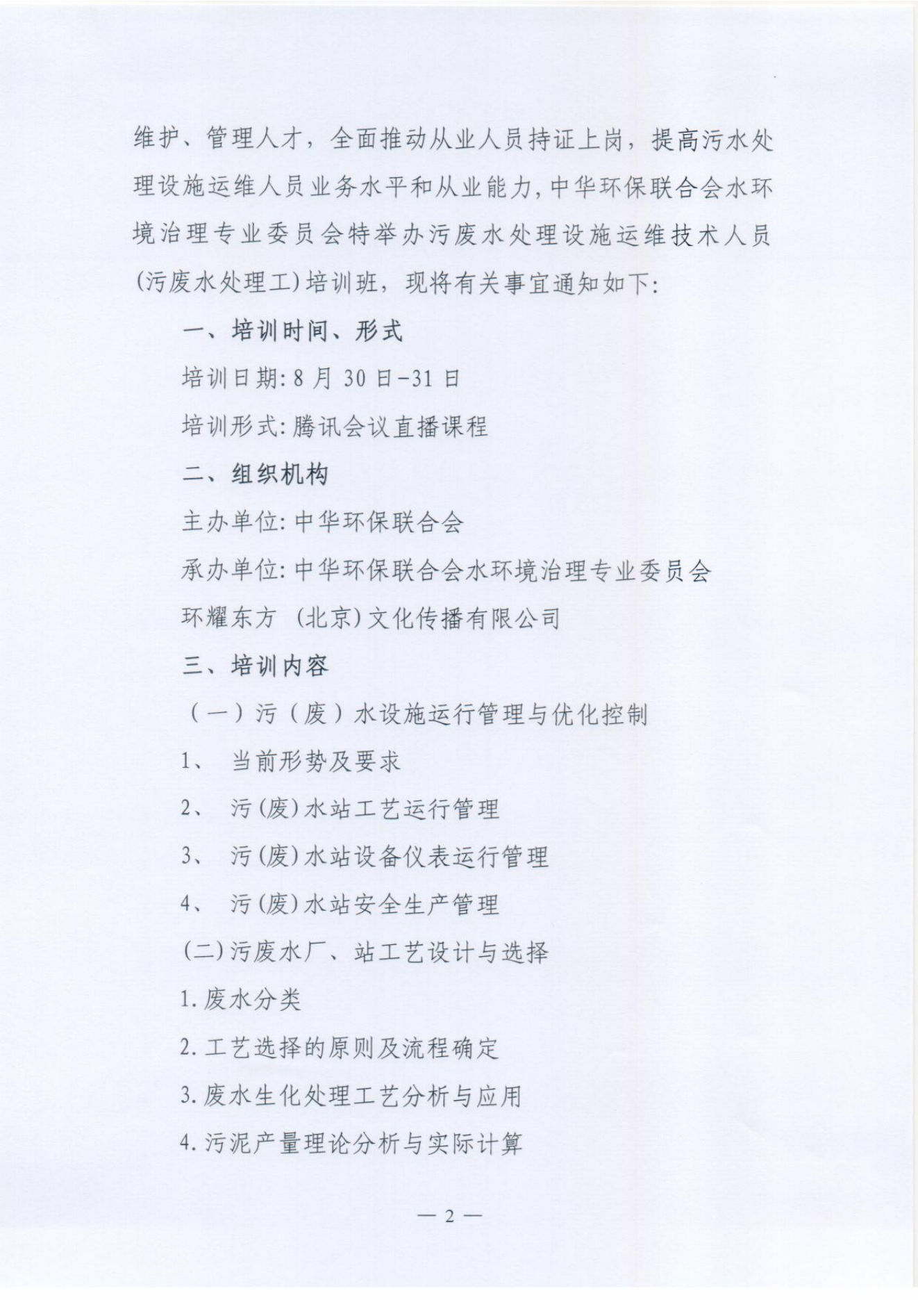 关于举办第九期污废水处理设施运维技术人员(污废水处理工)培训班的通知