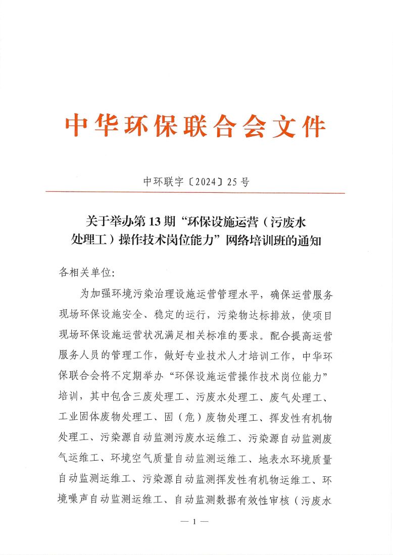 关于举办第13期“环保设施运营(污废水处理工)操作技术岗位能力”网络培训班的通知