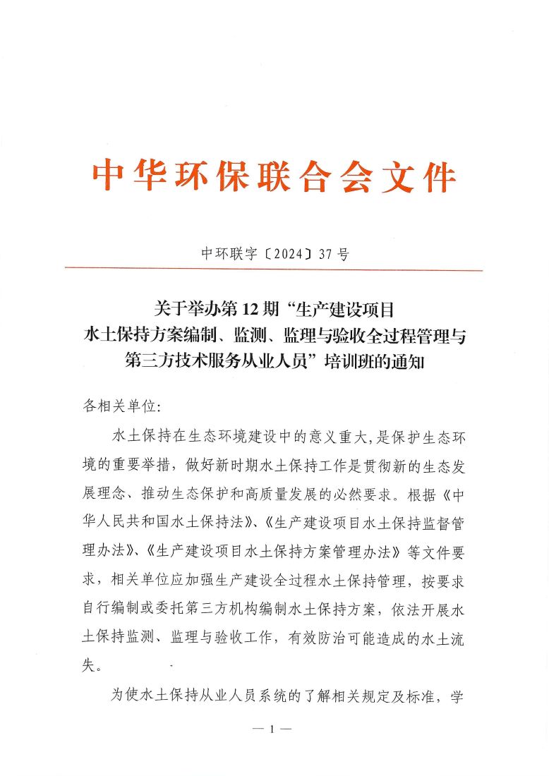 关于举办第12期“生产建设项目水土保持方案编制、监测、监理与验收全过程管理与第三方技术服务从业人员”培训班的通知