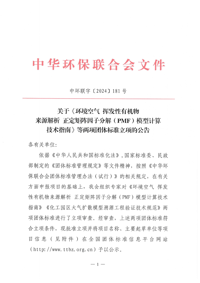 关于《环境空气 挥发性有机物来源解析 正定矩阵因子分解(PMF)模型计算技术指南》等两项团体标准立项的公告