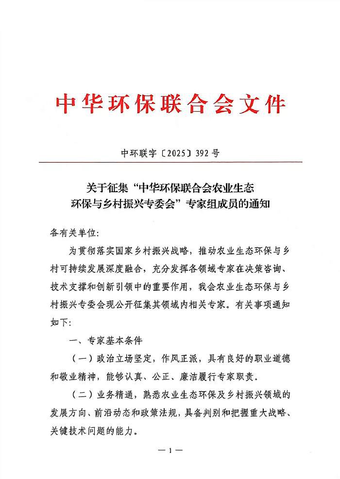关于征集"中华环保联合会农业生态环保与乡村振兴专委会"专家组成员的通知