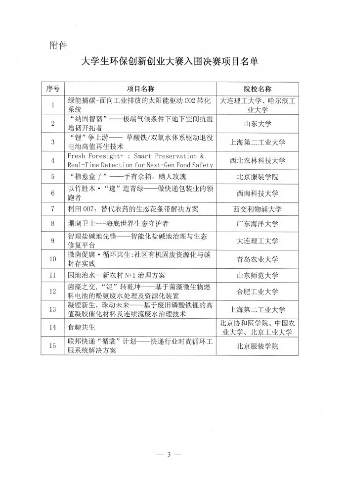 关于公示“联创未来”大学生环保创新创业大赛入围决赛项目名单的通知