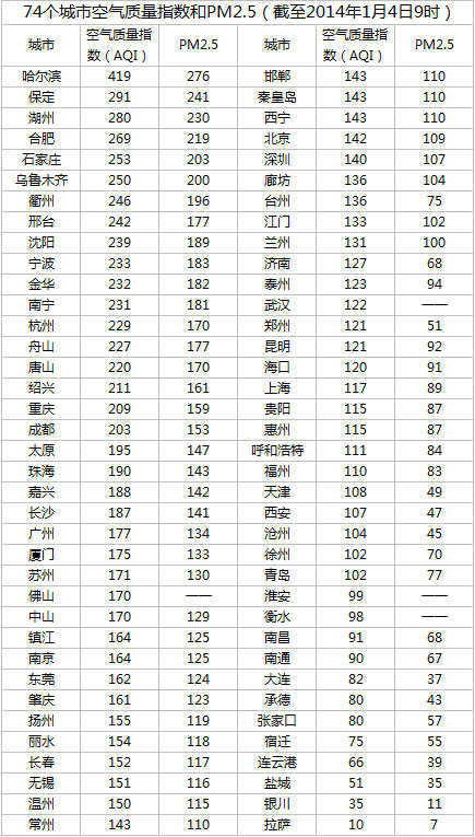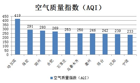 人民网北京1月4日电 (初梓瑞)截至今日早上9时,哈尔滨AQI(空气质量指数)达到419,属于严重污染,成为74个公布PM2.5数据城市中空气质量最差的城市。今日空气质量最差的10个城市分别是哈尔滨、保定、湖州、合肥、石家庄、乌鲁木齐、衢州、邢台、沈阳和宁波,其中哈尔滨PM10指数突破500,高达519“爆表”。