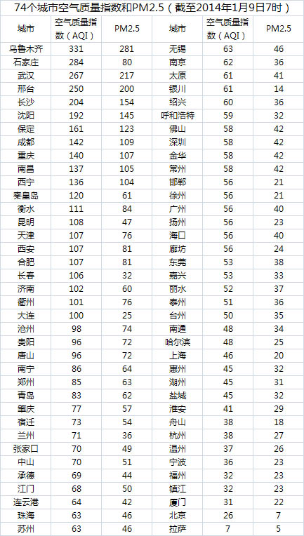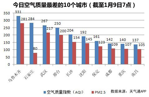 人民网北京1月9日(蒋琪)截至今日早上7时,乌鲁木齐的AQI(空气质量指数)达到331,属于六级严重污染,成为74个公布PM2.5数据城市中空气质量最差的两个城市。今日空气质量最差的10个城市分别是乌鲁木齐、石家庄、武汉、邢台、长沙、沈阳、保定、成都、重庆、南昌。其中石家庄、邢台、保定3个城市属于河北省。