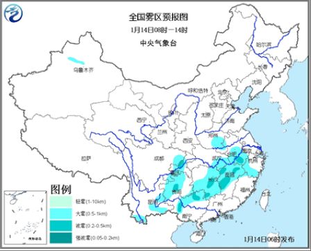 人民网北京1月14日电 (杨翼)今天白天到夜间,随着南方较大范围雨雪天气的结束,我国大部地区天气重归平静,降水罕至。预计今天早晨到上午,大雾天气仍将持续。中央气象台今晨6时继续发布大雾黄色预警:四川盆地东部、重庆中西部、贵州中西部、云南南部、河南东南部、安徽南部、浙江西部和南部、江西、湖南、广西北部、福建西北部以及新疆沿天山地区等地有大雾,其中,安徽南部、江西北部、湖南中部和东南部、广西西部和北部、重庆西部、贵州中部等地的部分地区有能见度不足500米的浓雾。