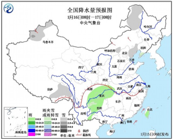 16日08时至17日08时,新疆西北部、内蒙古东北部、河北东北部、贵州西北部、西藏东部等地有小雪或雨夹雪;四川盆地大部、重庆、贵州中西部、云南东部、湖北西部等地有小雨或阵雨。南海东北部和西南部海域将有7~8级、阵风9级的东北风。