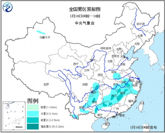 预计今天早晨到上午,大雾天气仍将持续。中央气象台今晨6时继续发布大雾黄色预警:四川盆地东部、重庆中西部、贵州中西部、云南南部、河南东南部、安徽南部、浙江西部和南部、江西、湖南、广西北部、福建西北部以及新疆沿天山地区等地有大雾,其中,安徽南部、江西北部、湖南中部和东南部、广西西部和北部、重庆西部、贵州中部等地的部分地区有能见度不足500米的浓雾。
