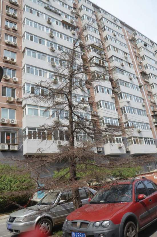 笔者询问了该小院的一位女业主。她说,这里的雪松从2011年11月就开始出现死亡现象,这与该小院的改造密切相关。原来,这个院子里的很多走道都是土路。一下雨,小区泥泞,不好走路和行车,但是雨水很容易下渗到地下去。从2011年11月开始,院子开始改造,将表土铲平,铺上不透水的柏油路面。路变得干净好走,但同时对树木带来了不利影响。