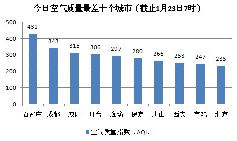 人民网北京1月23日电 (蒋琪)根据环保部公布的最新数据,截至今天早上7时,石家庄的AQI(空气质量指数)达到431,属于六级严重污染,成为161个参与空气质量排名的城市中空气质量最差的城市。今日空气质量最差的10个城市分别是石家庄、成都、咸阳、邢台、廊坊、保定、唐山、西安、宝鸡、北京。其中石家庄、邢台、廊坊、保定、唐山5个城市属于河北省。咸阳、西安、宝鸡3个城市属于陕西省。