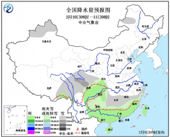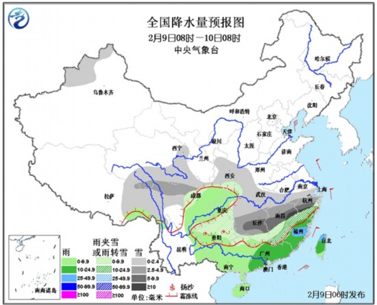 9日08时至10日08时,新疆西北部、陕西南部、青藏高原东部、江汉、江南大部、贵州中北部等地有小到中雪或雨夹雪,其中,湖南中部、江西中部、浙江中部偏南地区等地的部分地区有大雪,其中,江西东北部、浙江西部的局部地区有暴雪(10~12毫米);另外,贵州中部、湖南西北部、江西南部等地的部分地区有冻雨。四川盆地、华南、福建等地有小到中雨,其中,福建中部等地的部分地区有大雨。东海南部、台湾海峡、北部湾、南海北部有7~9级的风,黄海、东海北部有6~8级的风。