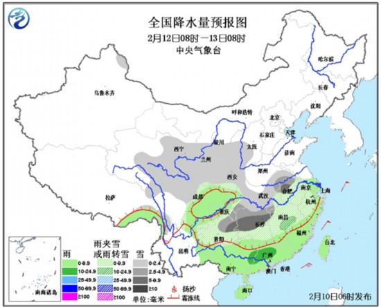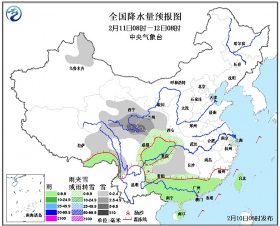中国气象网讯 10日~12日,南方地区多雨雪天气,气温偏低。10日~11日,西北地区东南部、四川北部、贵州、江南西部等地有小到中雪或雨夹雪,青海东南部的部分地区有大雪;12日开始,青藏高原东部及其以东地区将自西向东又有一次雨雪天气过程。