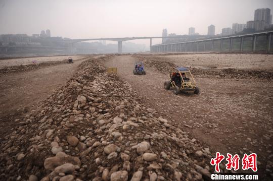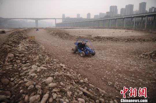 2月11日,重庆市民正在干枯的河床上开卡丁车比赛。嘉陵江重庆磁器口段大面积的河床裸露在外,成了市民的娱乐场。