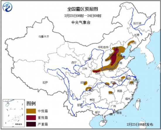 中央气象台今晨6时继续发布霾黄色预警:预计23日08时至24日08时,北京、天津、河北中南部、山东西北部、河南北部、陕西关中地区、山西南部等地气象条件不利于空气中污染物扩散,大部地区有中度霾,其中京津冀、陕西关中地区的部分地区有重度霾。同时,今天夜间至明天早晨,上述地区还可能出现能见度不足1公里的大雾天气。