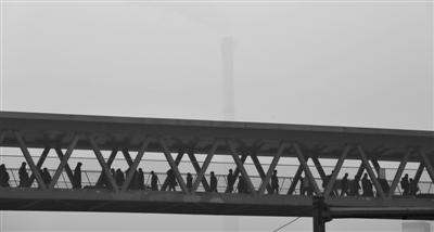 2月22日,东四环,行人走在天桥上,背后的烟囱在雾霾中若隐若现。记者 浦峰 摄
