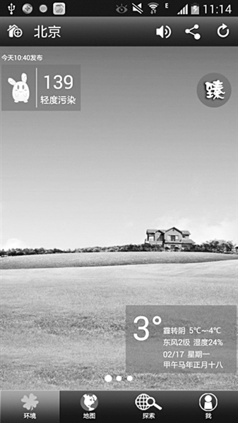 在App首页,点击右上方的生活馆,就可以看到晾晒指数、晨练指数、紫外线强度指数等,可以发送文字、图片以及环境问题的评论。围绕环境与生活,生活馆提供了一个方便交流的平台。每个生活帖,都面向全国用户,用户可以根据不同地域,浏览各地居民的环境与生活话题。除此之外,还有添加好友、焦点人物的功能;同时,版块内容还可以分享到微博、微信等新媒体平台。