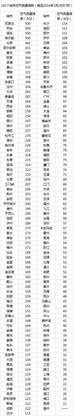 说明:自2014年1月1日起,环保部发布空气质量实时信息、空气质量月报及参与空气质量排名的地级城市已由74个增加到161个,包含了直辖市、省会城市、计划单列市、“三区”所有地级城市、环保重点城市和环保模范城市。人民网环保频道将采用环保部的官方数据,对161个城市每日空气质量进行排行。
