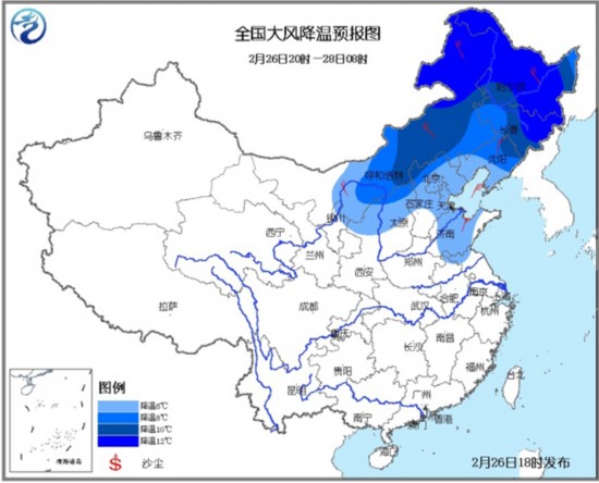 今天夜间到明天,黄淮以北地区将出现大风降温天气。中央气象台今日18时继续发布大风降温预报:26日夜间至27日,较强冷空气将自西向东影响我国北方地区,黄淮以北地区气温将出现6~10℃的下降,其中,内蒙古东北部、黑龙江大部、吉林东北部等地的部分地区降温幅度可达12℃以上,上述地区伴有4~6级偏北风。