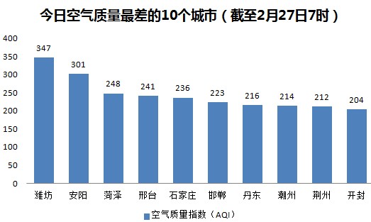 人民网北京2月27日电 (杨翼)受较强冷空气影响,昨天午后开始,内蒙古中部、河北北部、北京、天津先后刮起了3、4级偏北风,今晨,上述大部分地区的空气质量指数均为优或良,空气转好。根据环保部公布的最新数据,截至今天早上7时,潍坊的AQI(空气质量指数)达到347,属于六级严重污染,成为161个参与空气质量排名的城市中空气质量最差的城市。今日空气质量最差的10个城市分别是潍坊、安阳、菏泽、邢台、石家庄、邯郸、丹东、潮州、荆州和开封。