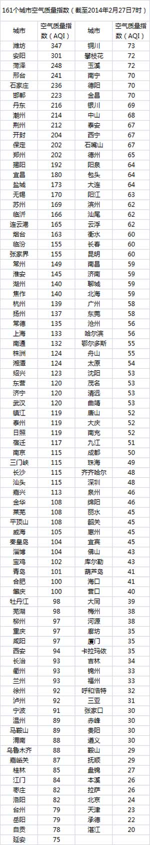 说明:自2014年1月1日起,环保部发布空气质量实时信息、空气质量月报及参与空气质量排名的地级城市已由74个增加到161个,包含了直辖市、省会城市、计划单列市、“三区”所有地级城市、环保重点城市和环保模范城市。人民网环保频道将采用环保部的官方数据,对161个城市每日空气质量进行排行。