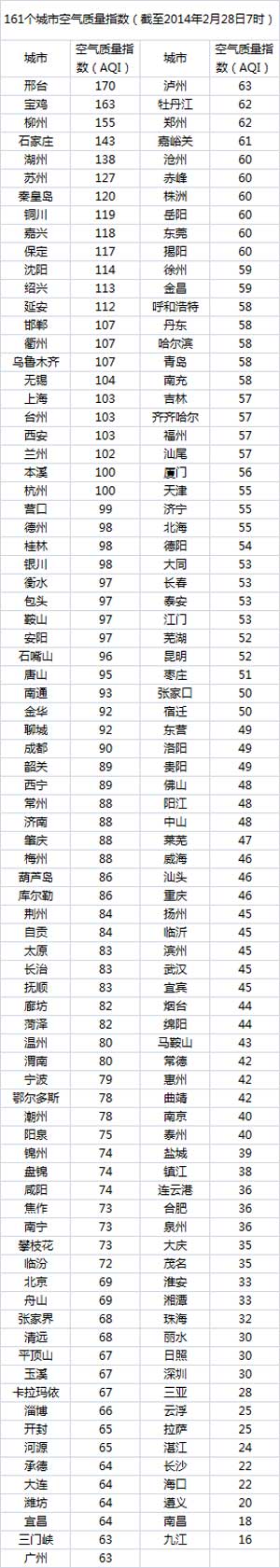 说明:自2014年1月1日起,环保部发布空气质量实时信息、空气质量月报及参与空气质量排名的地级城市已由74个增加到161个,包含了直辖市、省会城市、计划单列市、“三区”所有地级城市、环保重点城市和环保模范城市。人民网环保频道将采用环保部的官方数据,对161个城市每日空气质量进行排行。