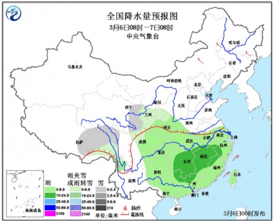 6日08时至7日08时,西藏东部、青海东部、川西高原北部、甘肃南部、宁夏南部等地有小雪或雨夹雪;陕西南部、黄淮西部、江汉、江淮、江南、华南、西南地区东部、台湾等地有小到中雨。内蒙古东部、东北等地有4~5级风。东海南部、台湾海峡有7~9级的风,东海北部、南海东北部有6~8级的风。