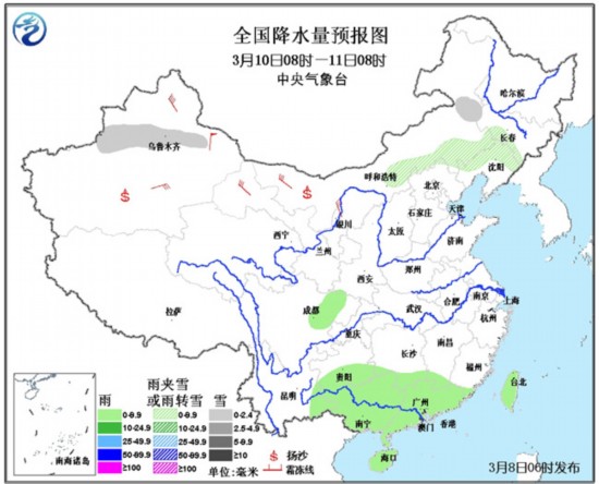 8日08时至9日08时,西藏东北部、新疆西部、黑龙江东部、辽东半岛南部、河北东北部等地有小雪或雨夹雪;天津、山东北部、西南地区东部、江南南部和东部、华南等地有小到中雨。东海南部海域将有7~8级、阵风9级的旋转风。